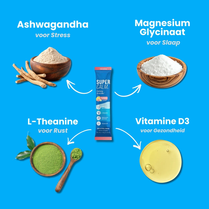 • Magnesium (as Glycinaat): 100 mg — Essentieel voor ontspanning.